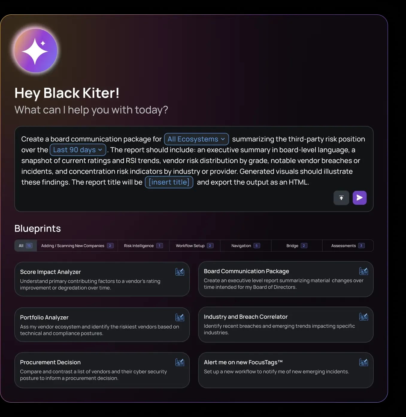 Black Kite’s pre-built Blueprints accelerate key use cases including deep dive investigations and TPRM board reporting.