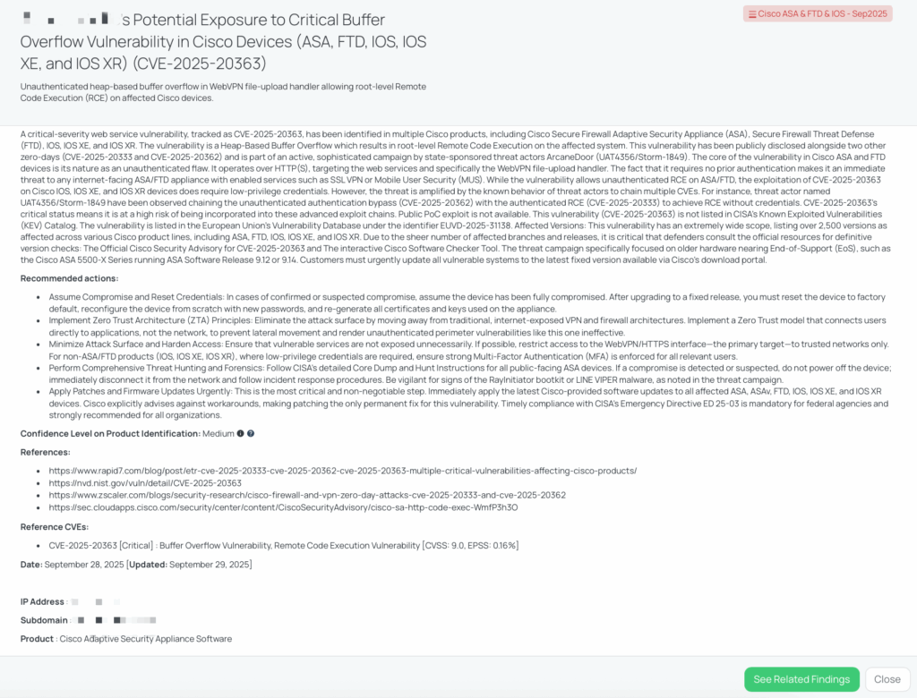 Black Kite published the Cisco ASA – Sep2025 Focus Tag on September 26, 2025, shortly after the vulnerabilities were added to the CISA KEV catalog. The Focus Tag identifies vendors potentially exposed to these zero-days and provides associated IP addresses or subdomains tied to ASA/FTD deployments.