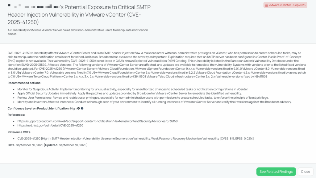 Black Kite released the VMware vCenter – Sep2025 Focus Tag on September 30, 2025, mapping out vendors potentially at risk from CVE-2025-41250. The tag identifies exposed vCenter assets, including IPs and subdomains, allowing risk teams to: