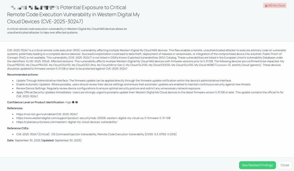 Black Kite released the WD My Cloud Focus Tag on September 30, 2025, identifying vendors potentially running vulnerable NAS devices. The tag highlights exposed assets, such as IP addresses and device subdomains, that may host outdated firmware.