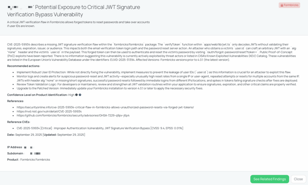 Black Kite published the Formbricks Focus Tag (late September 2025), mapping vendors and assets that may be running vulnerable Formbricks versions. TPRM teams can use the tag to: